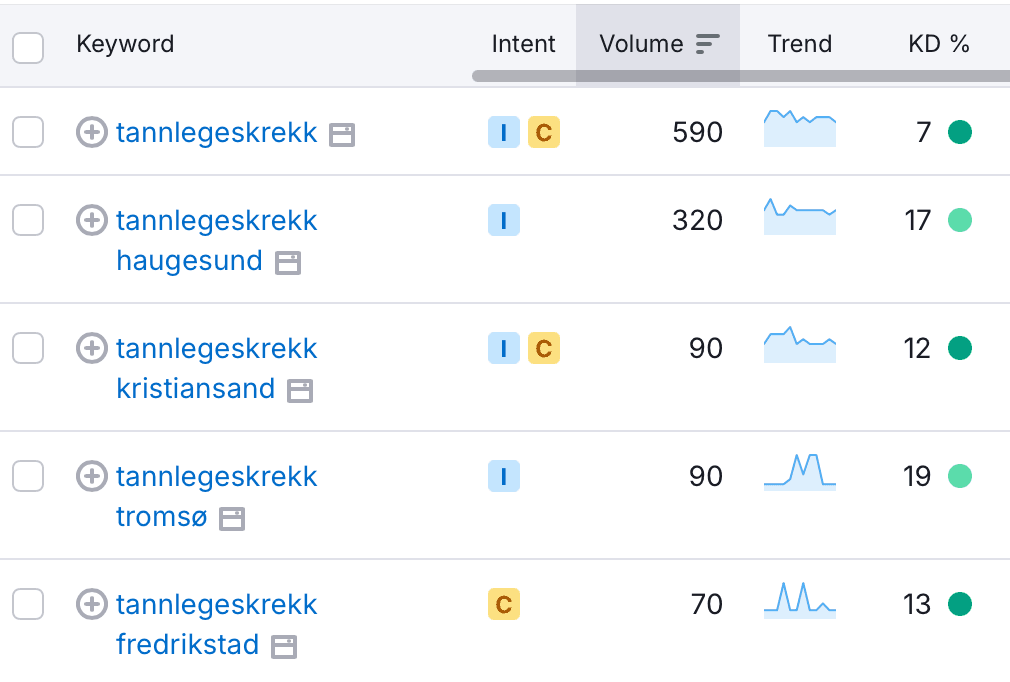 1. Start med ‘høy intensjon’-søkeord (tannlege + by, akutt tannlege).