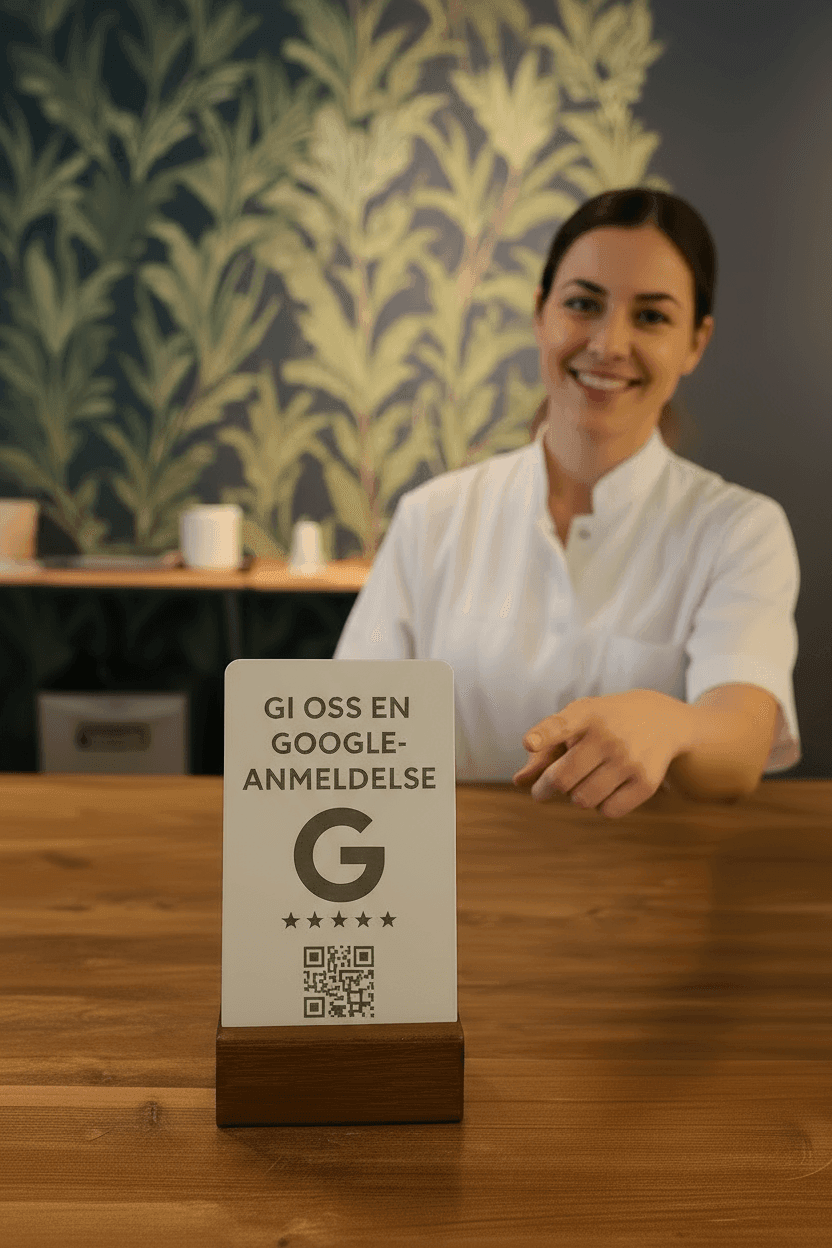 Plasser stativet synlig i resepsjonen eller venteområdet, og be fornøyde kunder om å de kan tenke seg å legge igjen en anmeldelse. Kundene skanner QR‑koden direkte med mobilen og kommer rett inn på anmeldelsessiden. Du kan også dele lenken digitalt i takk‑e‑poster, kvitteringer og chat‑dialoger for enda flere anmeldelser.